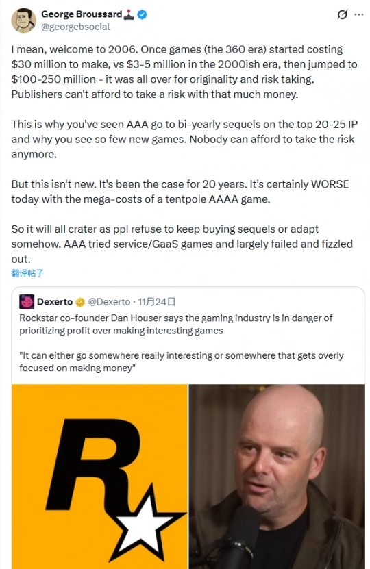 此番讨论源于《毁灭公爵》联合创始人乔治·布鲁萨德(George Broussard)对Rockstar联合创始人丹·豪瑟(Dan Houser)观点的回应。豪瑟此前曾表示,游戏产业可能"走向真正有趣的方向,也可能过度聚焦于赚钱"。布鲁萨德则认为这种现象并不新鲜,并指出:"一旦游戏(Xbox 360时代)开发成本从2000年左右的300-500万美元增至3000万美元,随后又跃升至1-2.5亿美元——原创性和风险承担就终结了"。他强调,发行商无法承担如此巨大的资金风险,这导致3A级作品集中在20-25个顶级IP上,且续作频出,全新游戏寥寥无几。