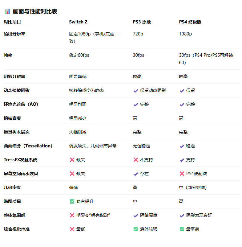如今,不少开发商已能在Switch 2平台上推出画面表现比肩甚至部分超越Xbox Series S的移植游戏,可这次看到本作不仅大幅删减原有特效,连最早的非终极版PS3版本在视觉效果上都比新移植版更出色,着实让人失望。两者的差距主要体现在构建氛围感的阴影与植被系统上,而这些恰恰是12年前原作赖以支撑视觉表现力的核心要素。