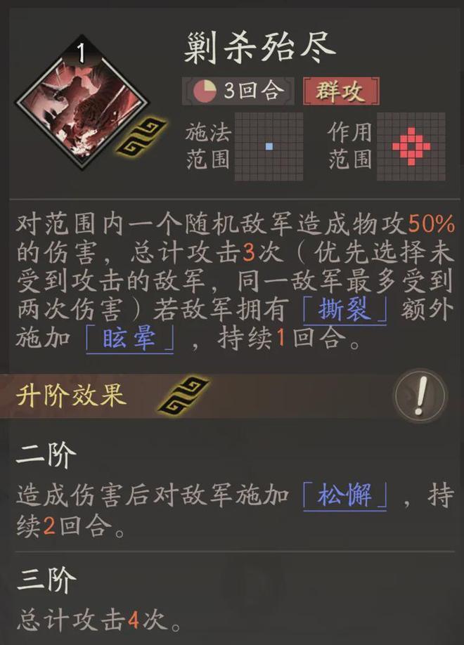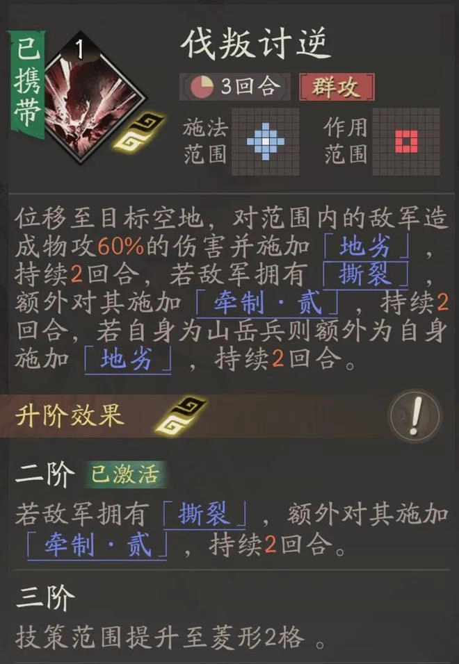 位移加范围输出的【伐叛讨逆】技能对牵招而言也颇具价值,毕竟范围输出能实现群体施加“撕裂”效果;而且该技能升至2阶后,会额外给带有“撕裂”的敌人附加“-2移动力”的debuff。由于牵招自身施加“撕裂”的判定环节在“牵制”效果触发之前,所以无论敌人是否已被提前挂上“撕裂”,直接使用牵招都能同时群体触发“撕裂”与“-2移动力”的效果。