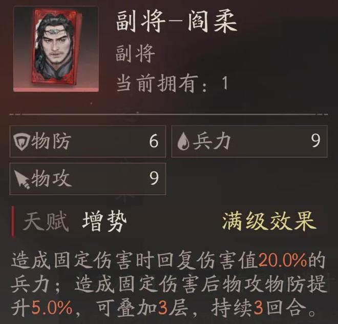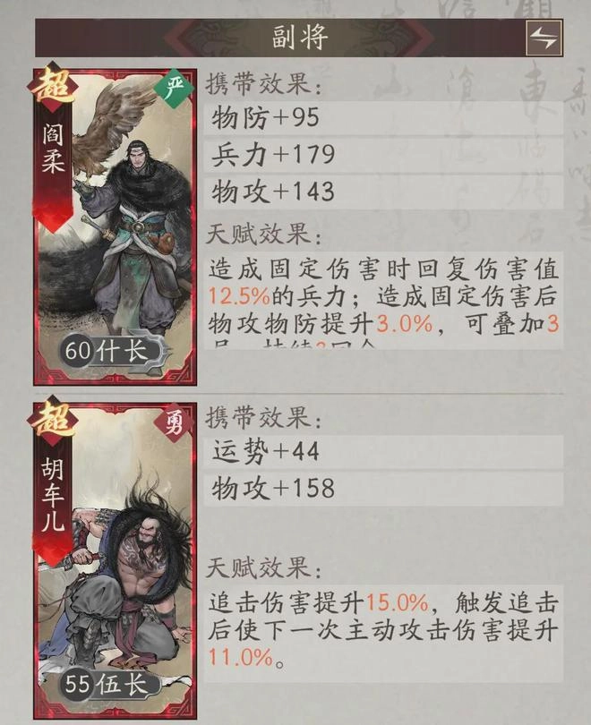 最后则是副将选择,目前的搭配是“阎柔”+“胡车儿”,其余例如夏侯昭、韩浩,包括黄色副将车胄、邢道荣等也可以纳入过渡的考虑范畴。
