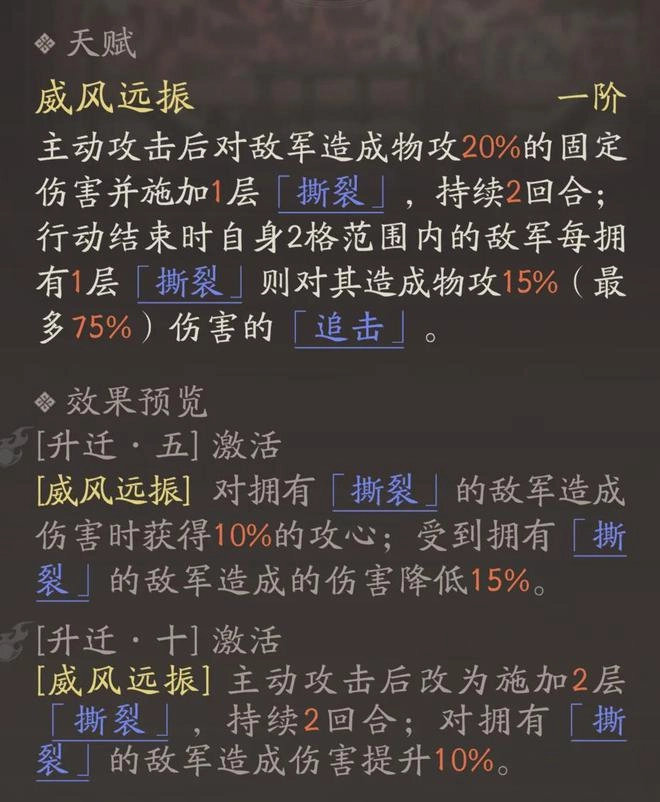 5阶之后,该技能会新增小幅吸血与减伤的特性;10阶时,则能提升施加“撕裂”的效率,同时增强牵招的伤害。不难看出,这个牵招的天赋效果基本都和“撕裂”状态紧密相关——敌人身上的“撕裂”层数越高,牵招触发的追击伤害就越可观。正因为如此,当我们把牵招作为主力输出手段时,仍需搭配一些可额外施加“撕裂”状态的友方角色,像张辽、乐进、陈到等人都是比较合适的选择。
