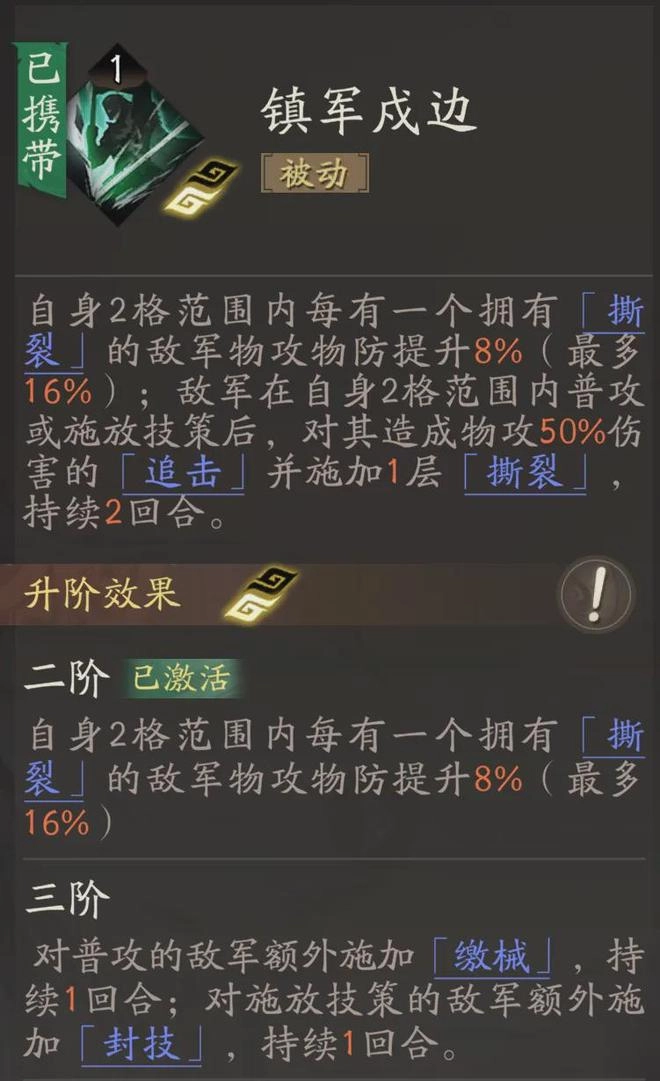 接下来我们再简要聊聊牵招的技能,其中【镇军戍边】技能差不多是牵招必须携带的技能,它所带来的自动追击以及施加“撕裂”状态的效果和牵招的机制十分契合,并且这个技能要想达到理想效果还是得升到3阶,这里面的“缴械”与“封技”对敌人的限制作用相当明显。