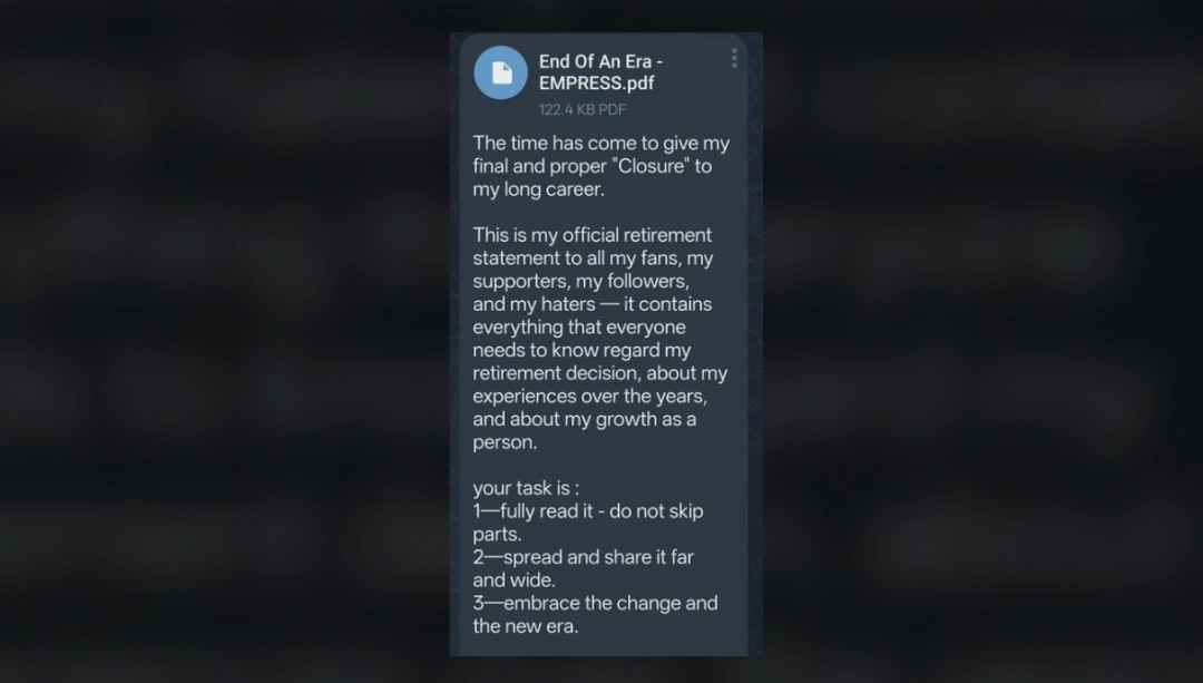 女皇最终在文末正式宣布停止自己的活动,称这段持续多年的时代就此终结。