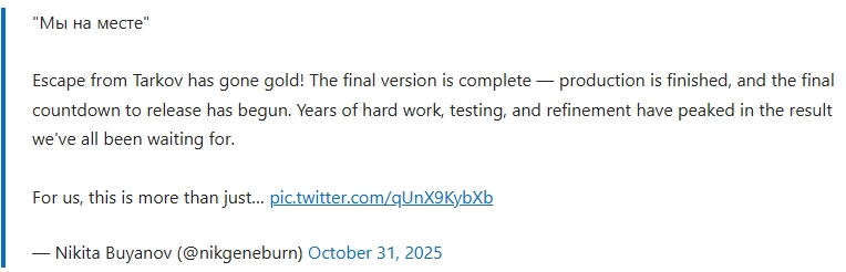 Battlestate Games工作室负责人Nikita Buyanov在10月31日通过X平台发布消息,宣布《逃离塔科夫》已完成正式开发工作,目前已进入正式发售的倒计时阶段,游戏预计于11月15日登陆Steam平台,敬请各位玩家期待。