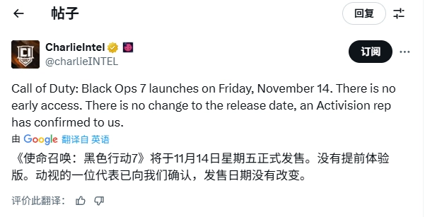 知名《使命召唤》消息源CharlieIntel也在X平台进一步证实了此事,称:“《使命召唤:黑色行动7》定于11月14日(星期五)推出,既无抢先体验环节,发售日期也不会变动。” 动视方面的代表已向该消息源确认了这一信息。