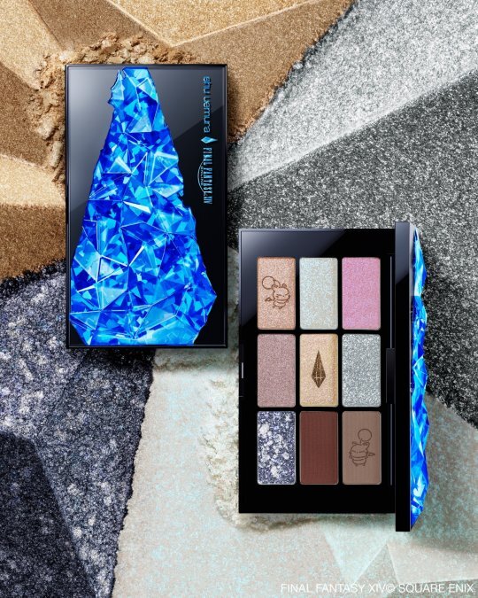这次《FF14》和植村秀携手打造的圣诞限定美妆系列,正是把虚拟世界里这份情感联结,变成了能触碰、能使用的现实物件。和普通美妆产品不一样,这些属于光之战士的“美妆装备”,从设计到细节都藏着对游戏的深度致敬:以母水晶为主题的眼影盘“水晶序曲”,外壳上的3D水晶浮雕模拟出游戏里母水晶流转光芒的奇幻质感,看着就像从水晶塔中得到的珍贵信物,指尖摸过就能想起初见母水晶时的震撼。盒里的“奇幻冰蓝”“落日橘光”等9种配色更有巧思,冷调的奇幻冰蓝复刻了冰神希瓦的凛冽气场,暖调的落日橘光还原了利姆萨·罗敏萨黄昏时的温柔光晕,叠加使用时的光影变化,正像艾欧泽亚大陆的昼夜交替。