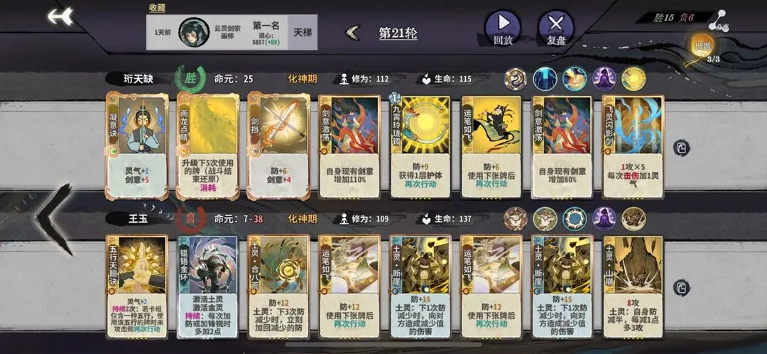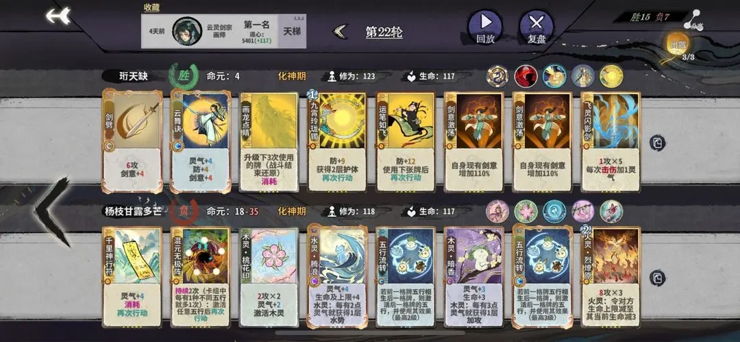 化神阶段要先保证拿到两张剑意激荡,以及二级飞灵或者流云,之后再去追求剑意+4的刻印。面对不同的阵容时,要灵活改变出手的先后顺序,充分借助镯子的护体效果来抵御关键的伤害。这套体系有足够的操作空间,而且容错率也比较高,适合各个水平层次的玩家运用。