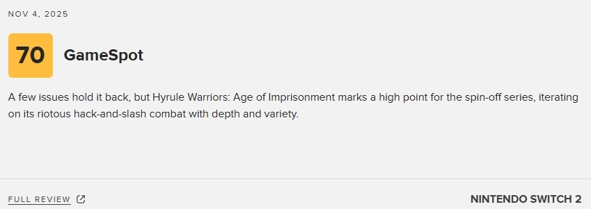 《塞尔达无双:封印战纪》即将正式发售,该作的媒体评分也已揭晓。目前,这款游戏在M站的媒体均分为79分,共收录了54家媒体的评价,其中知名媒体GS给出了7分的评分。