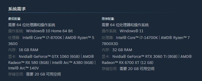 根据官方系统给出的配置要求,该游戏的最低运行条件为:操作系统需Windows 10,处理器选用Intel Core i7-8700K或者AMD Ryzen 5 3600,内存配备16 GB,显卡则采用GTX 1060或RX 580;若想拥有最优质的游戏体验,建议搭配Windows 11系统,处理器升级为i7-14700K或Ryzen 7 7800X3D,内存扩展至32 GB,显卡更换为RTX 3060 Ti或RX 6700 XT。