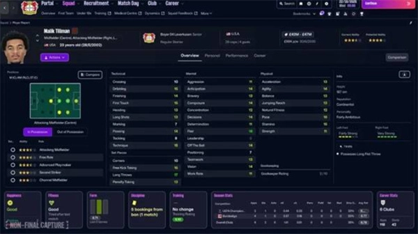 在《FM26》里,玩家刚接手球队就得面对换帅和阵容变动的情况。后防线有Quansah和Bade坐镇,前场则是Tillman与Ben Seghir担纲核心,球队做到了攻防两端都有可靠保障。