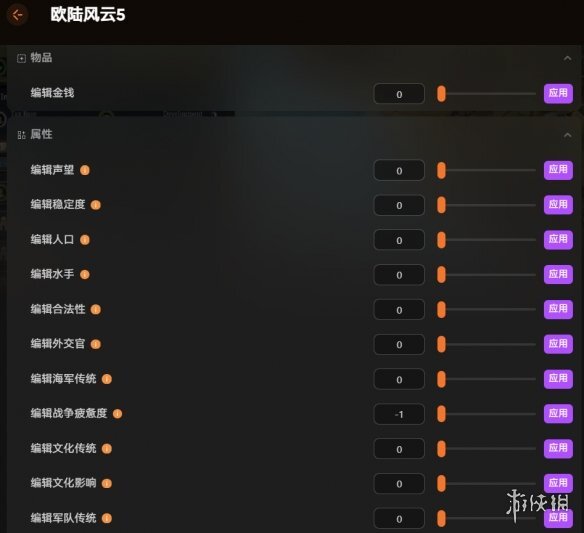 修改金钱、声望、稳定度、人口、水手、合法性、外交官、海军传统、战争疲惫度、文化传统、文化影响、军队传统以及编辑通货膨胀