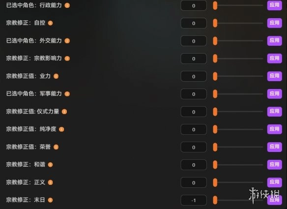编辑角色的行政能力、外交能力与军事能力,同时涵盖宗教修正相关的自控、宗教影响力、仪式力量、纯净度、荣誉、和谐、正义及末日等方面。