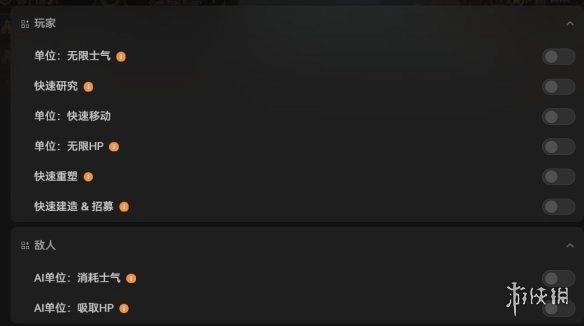针对作战玩法也有:无限士气、快速研究、快速移动、无限Hp,其中最好用的就是快速重塑、快速建造与招募,这些功能非常实用!