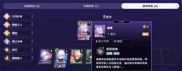 主C选用遐蝶,借助燃血与夜之半神这两个羁绊的组合,来达成爆发输出与资源收益的双重效果。