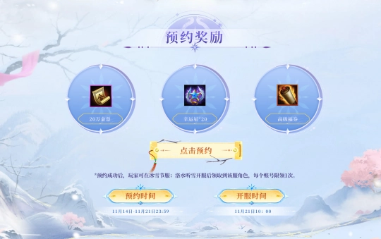 预约成功后,玩家可在冰雪节服:洛水听雪开服后领取到该服角色,