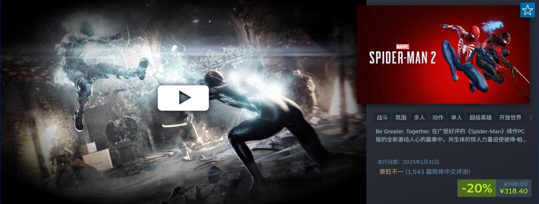 《漫威蜘蛛侠2》:原价318.4元,打8折,现价318.4元