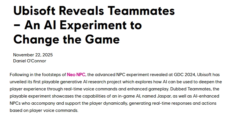 据了解,育碧此次新研究项目的设立初衷是“探索新技术对提升玩家游戏体验的作用”。其实早在2024年3月,育碧就曾公开过名为“NEO NPC”的研究项目,该项目旨在打造能与玩家实时对话而非依赖预设对话的角色,而此次的新计划或许可被看作是“NEO NPC”项目的升级版本。