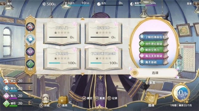 在每个时间段中采取的行动会影响爱丽丝的各项状态,最终决定她与谁结缘,以及选择何种职业。