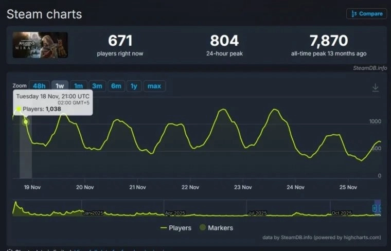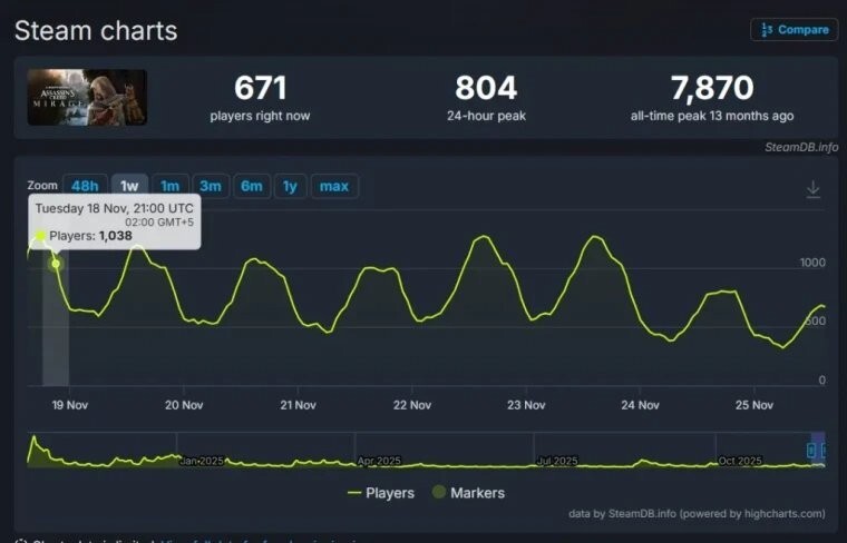 作为参照,《刺客信条:幻景》在Steam平台上的玩家峰值人数尽管一度突破七千,但该数据与《刺客信条:影》《英灵殿》《奥德赛》以及《起源》的成绩相比,仍存在明显差距。