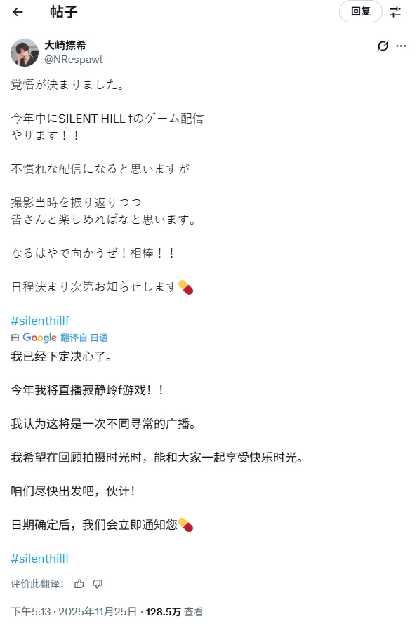 大崎捺希在社交平台X上透露,今年内他计划开启《寂静岭f》的游戏直播。尽管在直播操作上或许还不够娴熟,但他期待能借直播之机,一边重温当初参与拍摄时的种种经历,一边与观众们共同分享这份乐趣。具体的直播日程一旦敲定,他会第一时间告知大家。