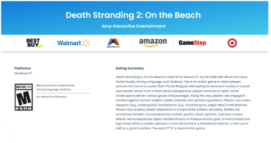 近日,《死亡搁浅2》PC版已正式通过ESRB评级,该版本被评定为M级(适合17岁以上人群),涉及血腥暴力、部分裸露、强烈语言及暴力内容。