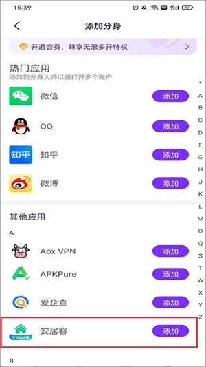 2、接下来,你需要挑选想要添加分身的应用程序;在软件里查看手机上已安装的应用列表,找到你想创建分身的那个应用,然后点击该应用右侧的添加按钮。