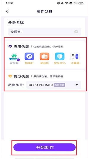 3、在弹出的窗口里,你得输入想给这个分身设定的名称;另外,你也能选择应用伪装或者机型伪装的选项——应用伪装是把分身伪装成其他应用的图标和名称,机型伪装则是将分身伪装成别的手机型号;你可以根据自己的需要,挑选合适的选项,然后点击开始制作按钮。