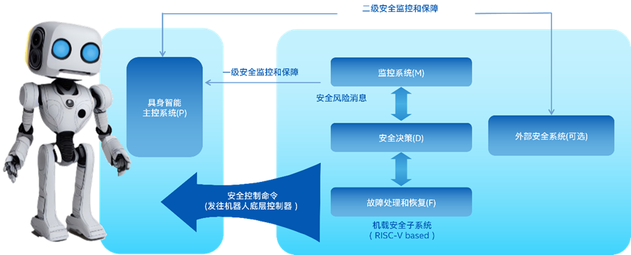 另外,《白皮书》还引入了PMDF安全架构,其目的是对风险进行系统性管理,保证机器人系统在各类复杂场景下能够安全运行。这一架构按照功能,把具备安全功能的机器人系统划分成四个在逻辑上相互独立的模块,具体包括具身智能主控系统(P)、监控系统(M)、安全决策(D)以及故障处理和恢复(F)。其中,M、D、F这三个模块共同构成了一个安全子系统,它可以借助RISC-V等独立的硬件来实现,这样既能够确保较高的安全性,又可以直接部署在机器人本体上。各个模块之间相互配合、协同工作,一同构建起牢固的安全屏障。
