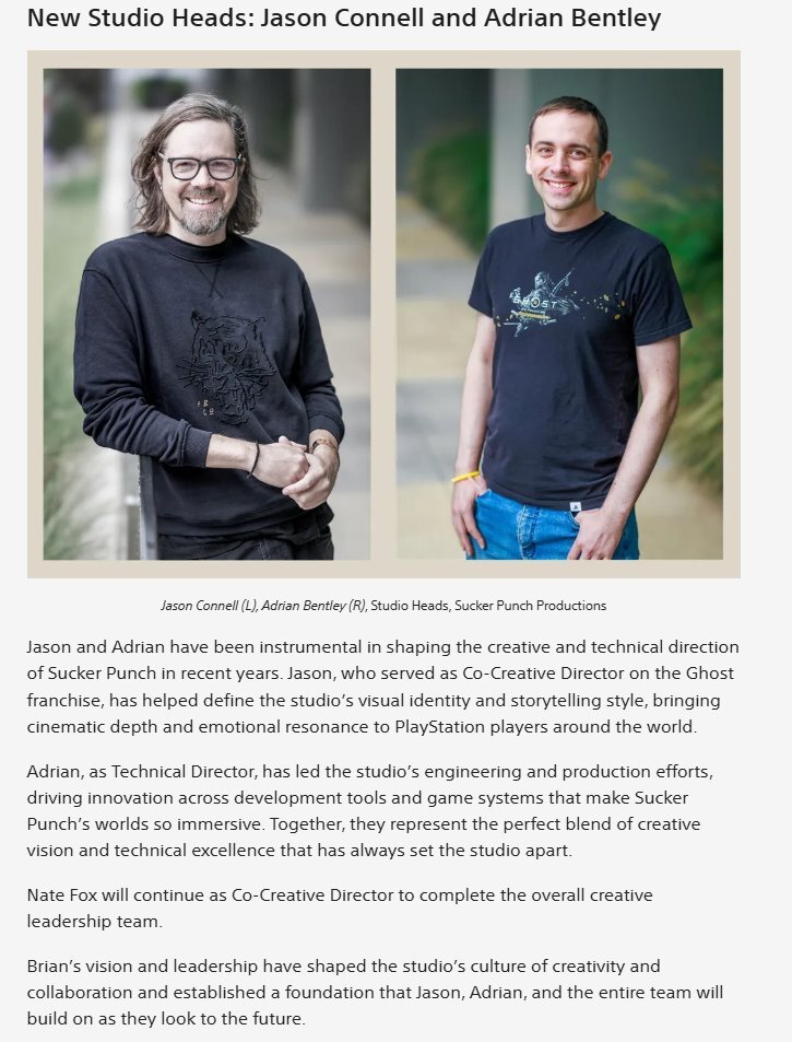 SIE宣布,自2026年1月1日起,长期在创意与技术领域担任领导职务的Jason Connell和Adrian Bentley将担任工作室负责人。此前,Jason曾任《Ghost》系列联合创意总监,Adrian则以技术总监身份主导工作室的工程与制作事务。