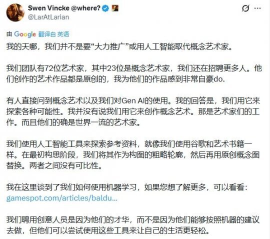 为平息相关争议,Swen通过IGN发布正式声明并着重强调:拉瑞安不会采用AI来取代任何开发人员,同时也不会推出含有AI生成内容的游戏。他在该声明里明确指出:
